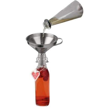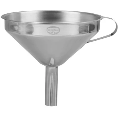 Der graue Trichter mit Siebeinsatz von Dr. Oetker ist ein echter Küchenhelfer aus Edelstahl. Er verfügt über eine schmale Öffnung und eine herausnehmbare Siebscheibe.