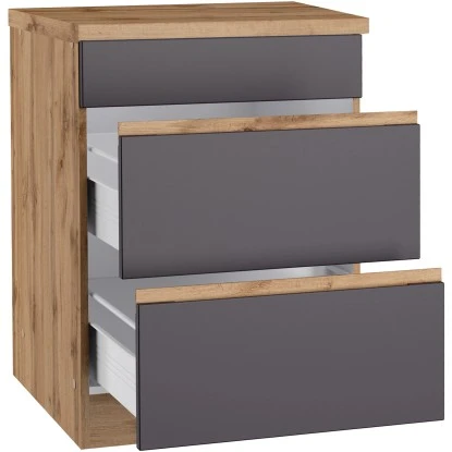 Mit dem Kochfeldumbauschrank Turin von Held Möbel können Sie ihre Küchenzeile perfekt ergänzen. Zwei Auszüge bieten zusätzlichen Stauraum für Töpfe und andere Küchenutensilien. Optisch begeistert der Schrank durch die klaren Linien sowie die zweifarbige Gestaltung. Da der Schrank in mehreren Farbkombinationen verfügbar ist, können Sie die Küche im Mix-and-Match Stil einrichten. Eine 28 mm starke Arbeitsplatte in Eiche Dekor ohne Ausschnitt für den variablen Einsatz eines Kochfelds ist inklusive.