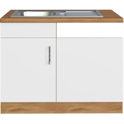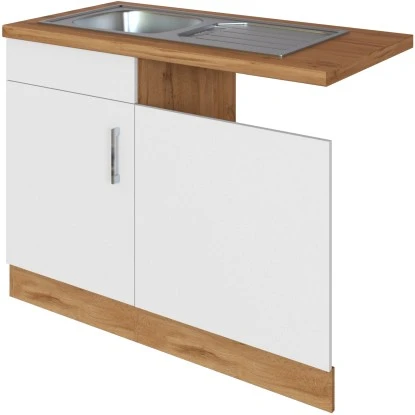 Das Held Möbel Spülzentrum Sorrento misst B x H x T: 110 cm x 85 cm x 60 cm, 1 Tür für Geschirrspüler teil – integriert, Arbeitsplatte ohne Ausschnitt, Einbauspüle B x T: 86 cm x 43,5 cm, Beckenmaße B x H x Beckentiefe: 37 cm x 34 cm x 14 cm, Metallgriff