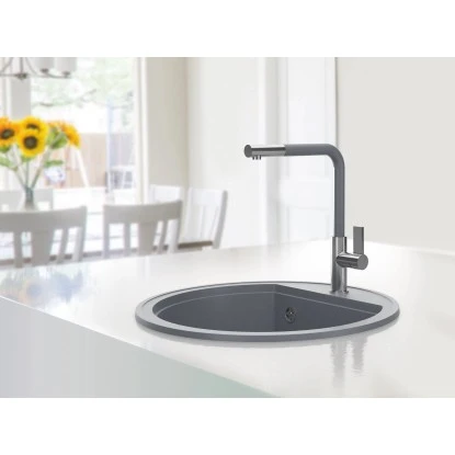 Die Miló Einbauspüle Olli lässt sich mit ihrer schlichten und zeitgemäßen Optik in jede Küche integrieren. Mit ihrem Granitverbundstoff bietet sie eine hochwertige Qualität und bereitet lange Freude. Dazu ist die Spüle ideal für den täglichen Abwasch, das Abgießen von Nudeln oder Waschen von Obst und Gemüse gestaltet. Mit ihrem modernen Design in Grau und der runden Form ist sie ein echter Hingucker. Eine glatte Oberfläche unterstreicht das ansprechende Erscheinungsbild. Die Einbauspüle hat einen Ø von 51 cm und misst eine Höhe von 21,5 cm. Das Becken hat die Maße 44,5 cm x 21,5 cm (B x T).