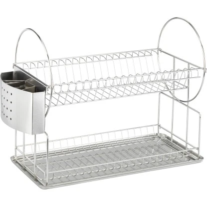 Der hochwertige Geschirrabtropfer Duo mit separatem Auffangtablett verhindert Wasserbildung und beugt Kalkflecken auf der Spülbeckenablage vor. Er dient als funktionelles Zubehör für die Spüle in der Küche, im Gartenhaus oder im Wohnmobil. Auf zwei Ablagen bietet der Geschirrabtropfer aus rostfreiem Edelstahl Stellplatz für Teller, Tassen oder Gläser. Der zusätzliche Besteckkorb kann seitlich am Regal eingehängt werden. Nach dem Gebrauch ist der Geschirrabtropfer Duo platzsparend zusammenlegbar.
