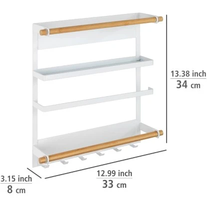 Gefertigt sind die Stäbe des Regals aus hochwertigem Bambus, welcher hart und widerstandsfähig ist. Auch unter ökologischen Aspekten bietet das Material klare Vorteile: Bambus ist ein schnell nachwachsender Rohstoff und liegt dank seiner Natürlichkeit absolut im Trend. Silikonringe an den jeweiligen Enden der beiden Stäbe verhindern ein ungewolltes, seitliches Verrutschen. In Kombination mit der Regalkonstruktion aus hochwertigem, pulverbeschichteten Metall in Weiß verleiht das Möbelstück Ihrer Küche unverzüglich ein warmes und natürliches Ambiente! Befestigen lässt sich das Gestell schnell und einfach mit zwei an der Rückseite befindlichen, breiten Magneten. Alternativ eignet sich auch doppelseitiges Klebeband zur Anbringung ohne Bohren. Dies ist im Lieferumfang enthalten. Der Ordnungshelfer Küchenregal Magna von Wenko erleichtert Abläufe und sorgt platzsparend für Ordnung in der Küche.